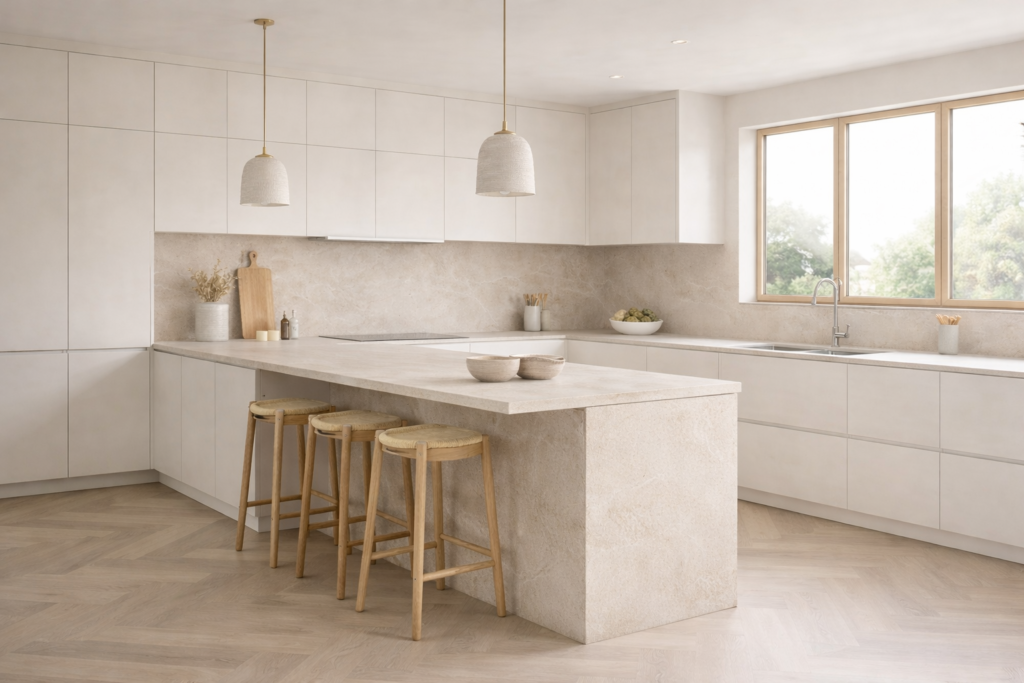 Cloud Dancer tworzy harmonijne połączenia z drewnem, kamieniem, metalem czy szkłem. Dzięki temu łatwo budować eleganckie i ponadczasowe aranżacje.