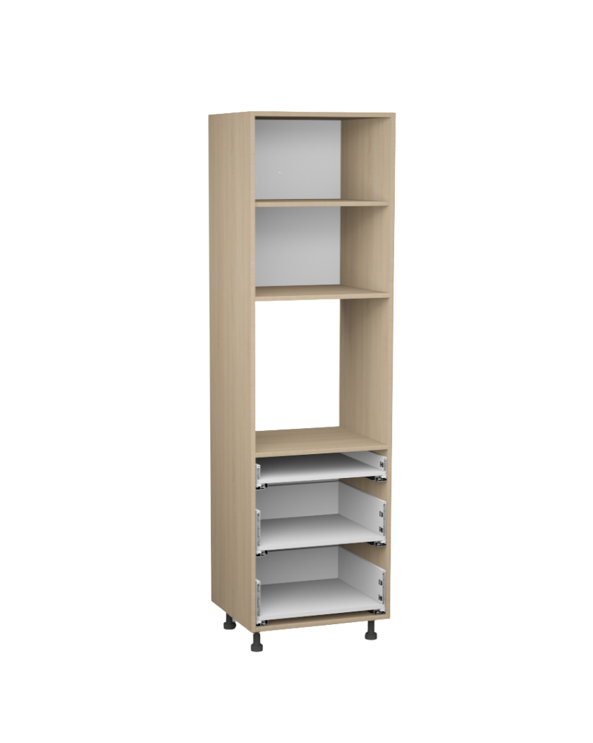 Funkcjonalny i solidny korpus kuchenny wysoki, zaprojektowany do estetycznej zabudowy piekarnika oraz wygodnego przechowywania w jednej, spójnej bryle meblowej. Zastosowanie trzech praktycznych szuflad w dolnej części umożliwia ergonomiczne rozmieszczenie sprzętu AGD oraz maksymalne wykorzystanie przestrzeni w pionie.